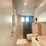 This apartment is equipped with a bathroom that features a hair dryer and towels. A shower and a toilet can also be found.